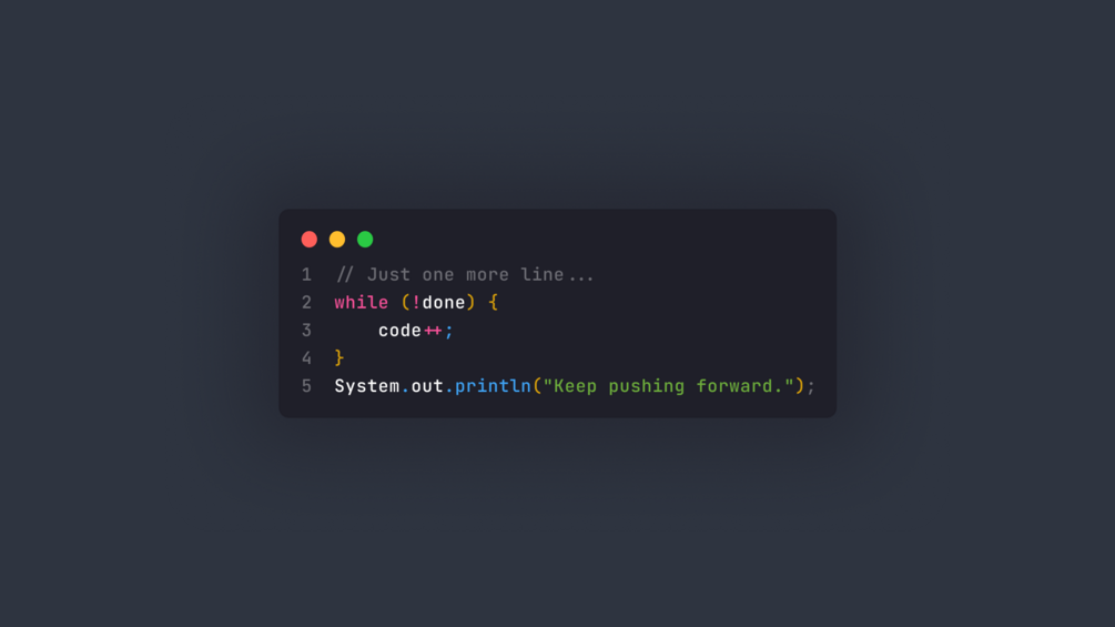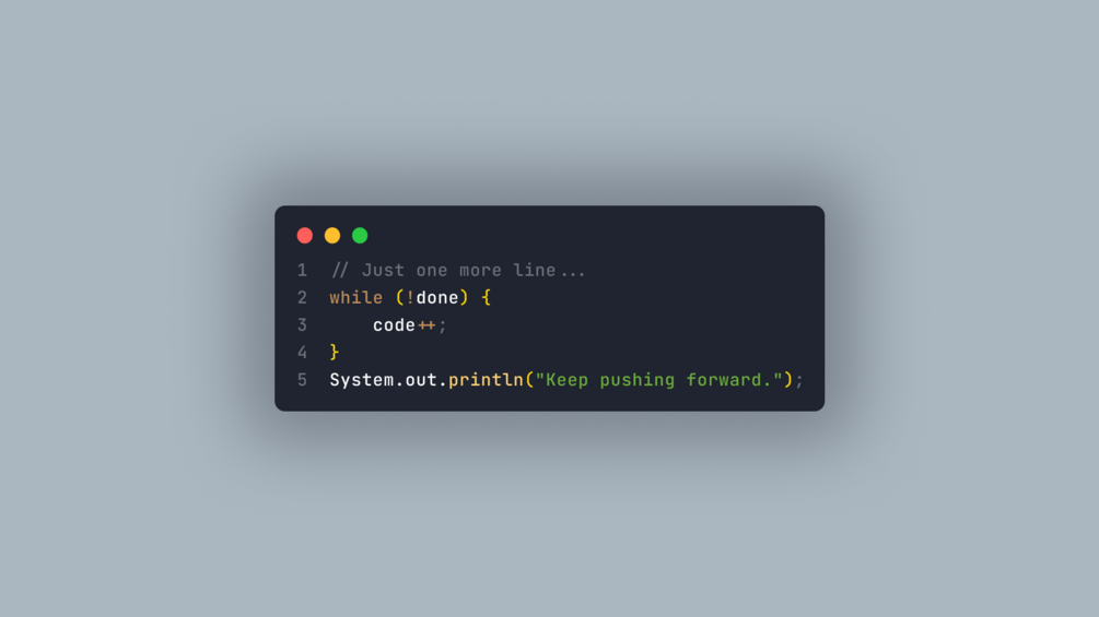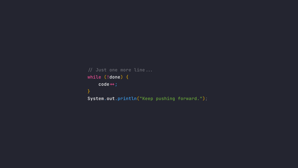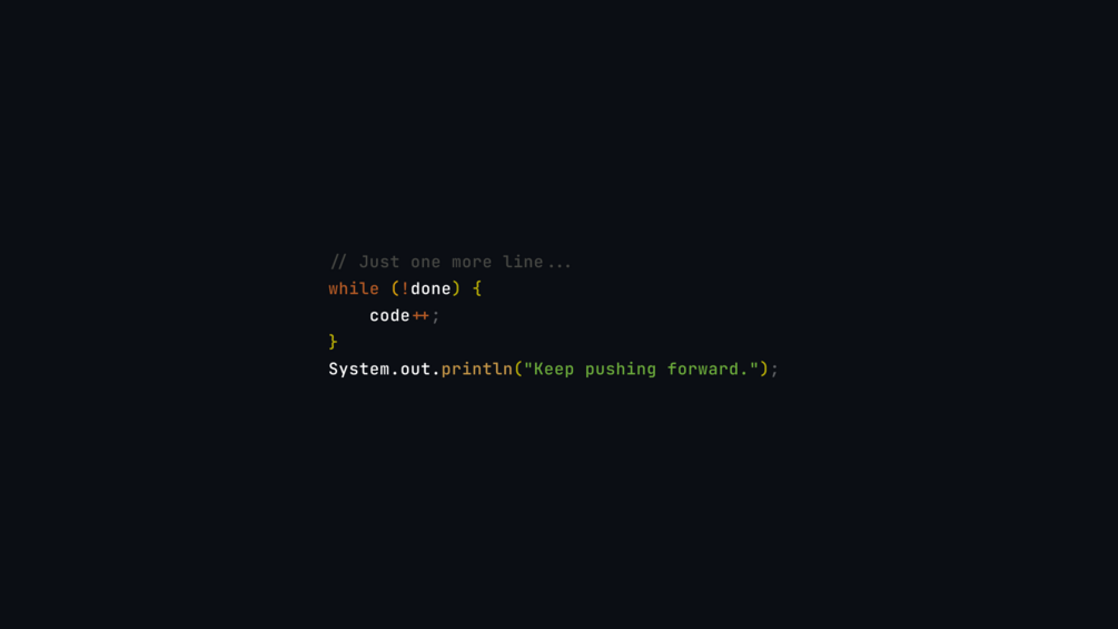 Coding Wallpaper 🖥️✨: A sleek, dark-themed terminal window with vibrant code colors. The Java snippet encourages you to keep coding and improving. Perfect for developers who love a minimalist and motivational setup! 🚀💻